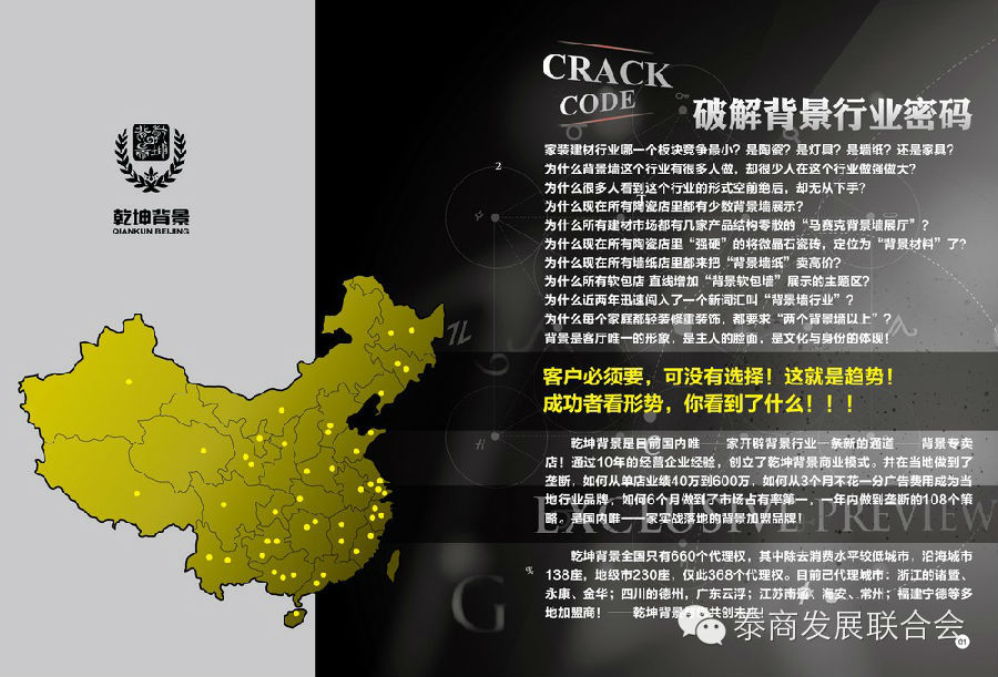 十年的建材行业经验,红海历程,乾坤背景不断的通过总结,实战并创立了乾坤背景商业模式。以三个月不花一分广告费做到了当地行业品牌,六个月做到了市场占有率第一,一年内做到了行业垄断的108个策略。是国内唯一一家实战落地的背景墙加盟品牌,并进行系统持续的建设和推广。