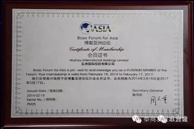 8月18日,五洲国际收到博鳌亚洲论坛授予的白金会员证书牌匾。此前2月18日集团已正式成为博鳌亚洲论坛白金会员,这标志着五洲国际的发展迈上了一个新的台阶。
