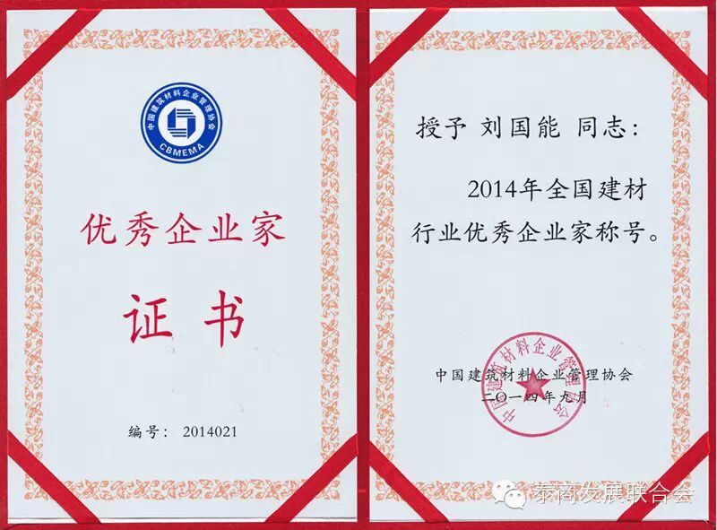目前,由中国建筑材料企业管理协会主办的2014年全国建材行业优秀企业家评选活动,经过严格的申报、初评、终审和公示等程序后正式落下帷幕,业内76位同志荣获2014年全国建材行业优秀企业家称号。 国盛基业集团董事长刘国能在敢于创新、勇于担当、善于经营、精于管理、诚信守法、认真履行社会责任等方面业绩突出,荣获2014年全国建材行业优秀企业家殊荣。