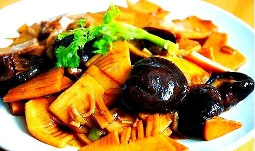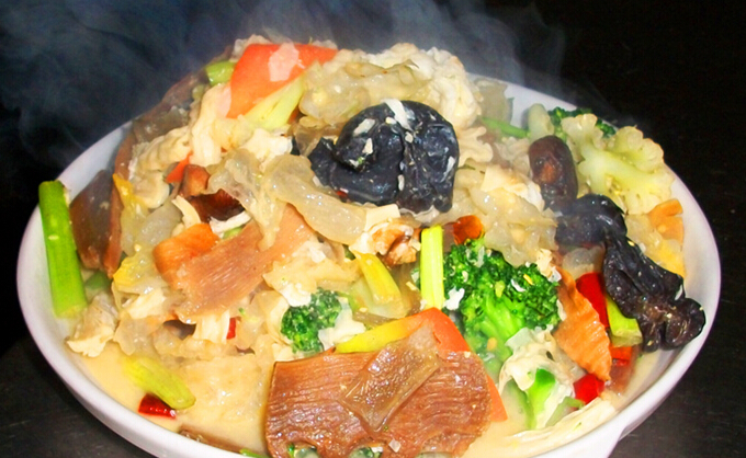 美名“锦绣山河”。这同样是一道大杂烩,配料主要有青菜、西兰花、胡萝卜、猪皮、香菇等。泰顺农家置酒席和百家宴上都少不了这道菜。