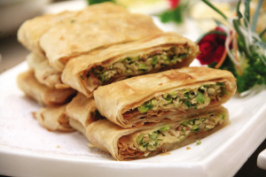 也称薄饼,做法是先将上等大米浸透,磨成浓淡适度的米浆,摊在烧热的平底锅上煎成一张厚薄均匀的完整饼皮,然后取出一张饼皮摊平,披上一层由碎精肉、香菇、木耳、虾仁、干贝、花生、芝麻、蛋丝、葱白等做成的馅心;再加上一层饼皮,又放上一层馅心;再加上一层饼皮,又放上一层馅心,如此反复数遍,然后卷成长条,压扁,置于平底锅上文火煎烤,于是就有一种悦耳的“吱吱”响声发出。待烤到通体金黄,喷香酥脆时,便可取出切段,于是一道香气四溢、叫人垂涎且名闻遐迩的婆饼就这样诞生了。