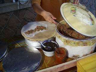 俗称馍糍干卷,这种省时好吃又实惠的小吃是泰顺老百姓最喜爱的早餐之一。在罗阳,到处都可见到加工米面层的摊子。做法是将米淘过后,浸泡至软,磨成米汤,所用的馅料可以凭自己喜爱先炒熟。将磨成的米汤舀取少许于蒸屉中,置锅中蒸煮约几十秒,取出,剥下,摊平,加入馅料,卷起即食。蒸屉常用竹子编织而成或者用铁器、铝器。