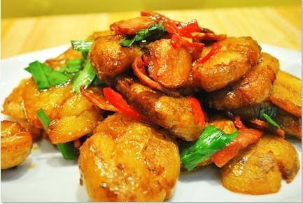 即将土豆(马铃薯)整个煮熟,轻力拍成厚约一公分左右的饼状,放入锅中,两面先后煎炸至起黄,加入调料,起锅。土豆还可以做成土豆汤,材料多是土豆丝,米线,笋干,辣椒等。为了不使马铃薯被打碎,以选用去年的马铃薯或熟冷马铃薯为佳。