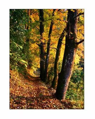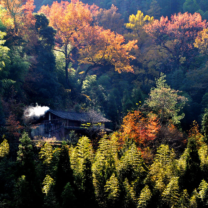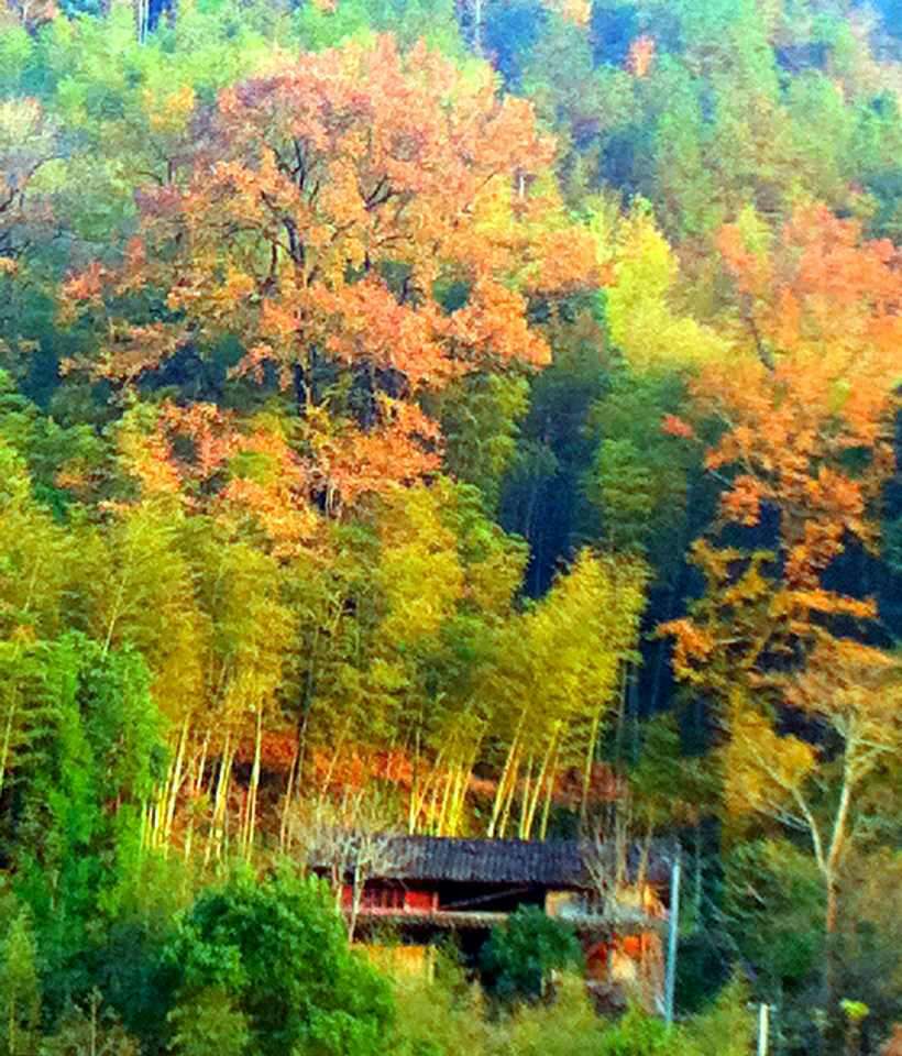 喜欢那一条古道,一排红枫,还有一座老房子所构成的一幅迷人的风情画卷,犹如世外桃源般温馨恬静!你看那袅袅升起的炊烟,那稍纵即逝的光影,暖暖的!