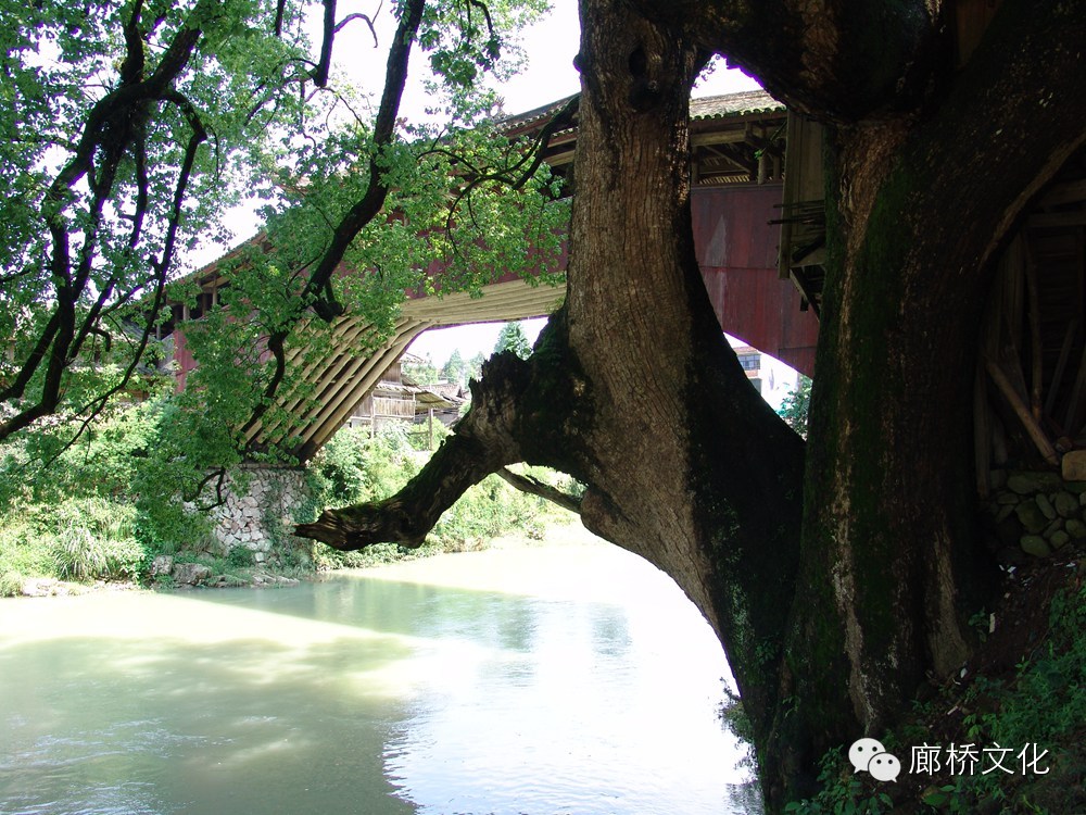 一条斜斜的弯弯的很有情调的石阶,将我等引到了廊桥的面前。桥堍上立着两棵大树,各有两抱粗细。叶子又向我们介绍,这原是不同品类的两种树,一棵是樟,一棵是桕,青枝绿叶间很难分辨,只有秋霜才是它俩的最好裁判。原因是一俟秋天,乌桕的叶子就会变红。红绿相染中,孰是孰非便一清二楚了。